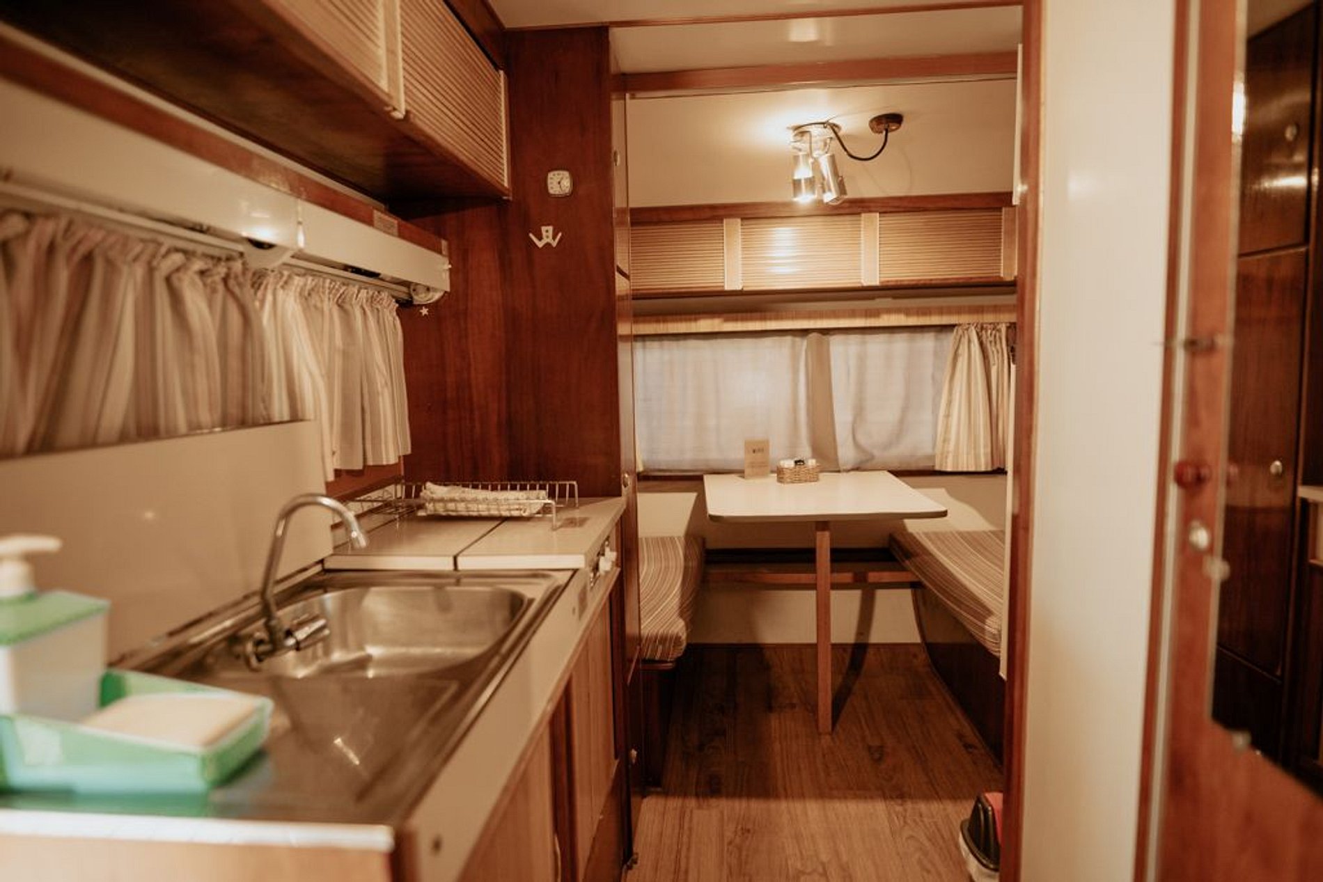 O Trailer Classic 1975 é uma verdadeira casa sobre rodas! Tem quarto, banheiro, cozinha com salinha e até uma varandinha com deck mesa e cadeiras na frente!