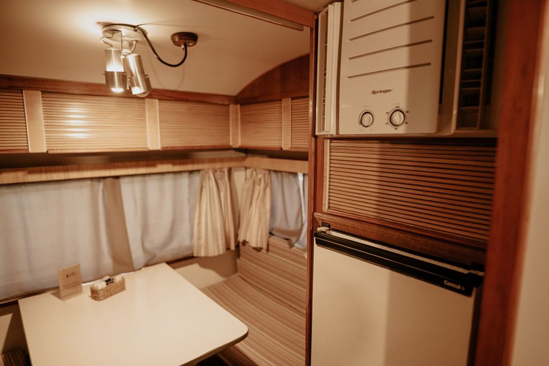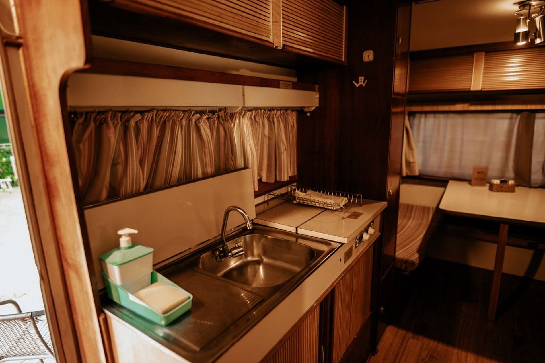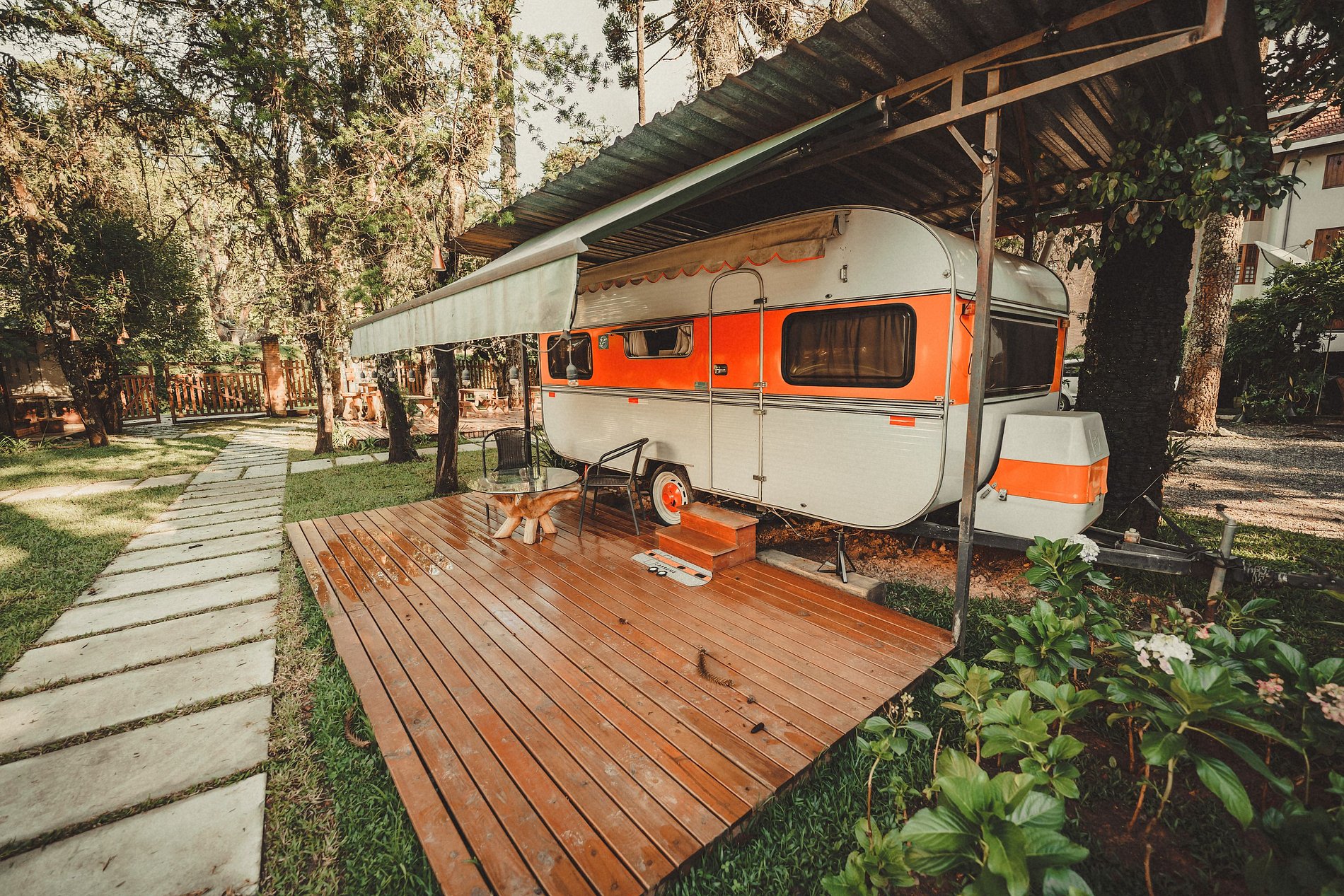 O Trailer Classic 1975 é uma verdadeira casa sobre rodas! Tem quarto, banheiro, cozinha com salinha e até uma varandinha com deck mesa e cadeiras na frente!