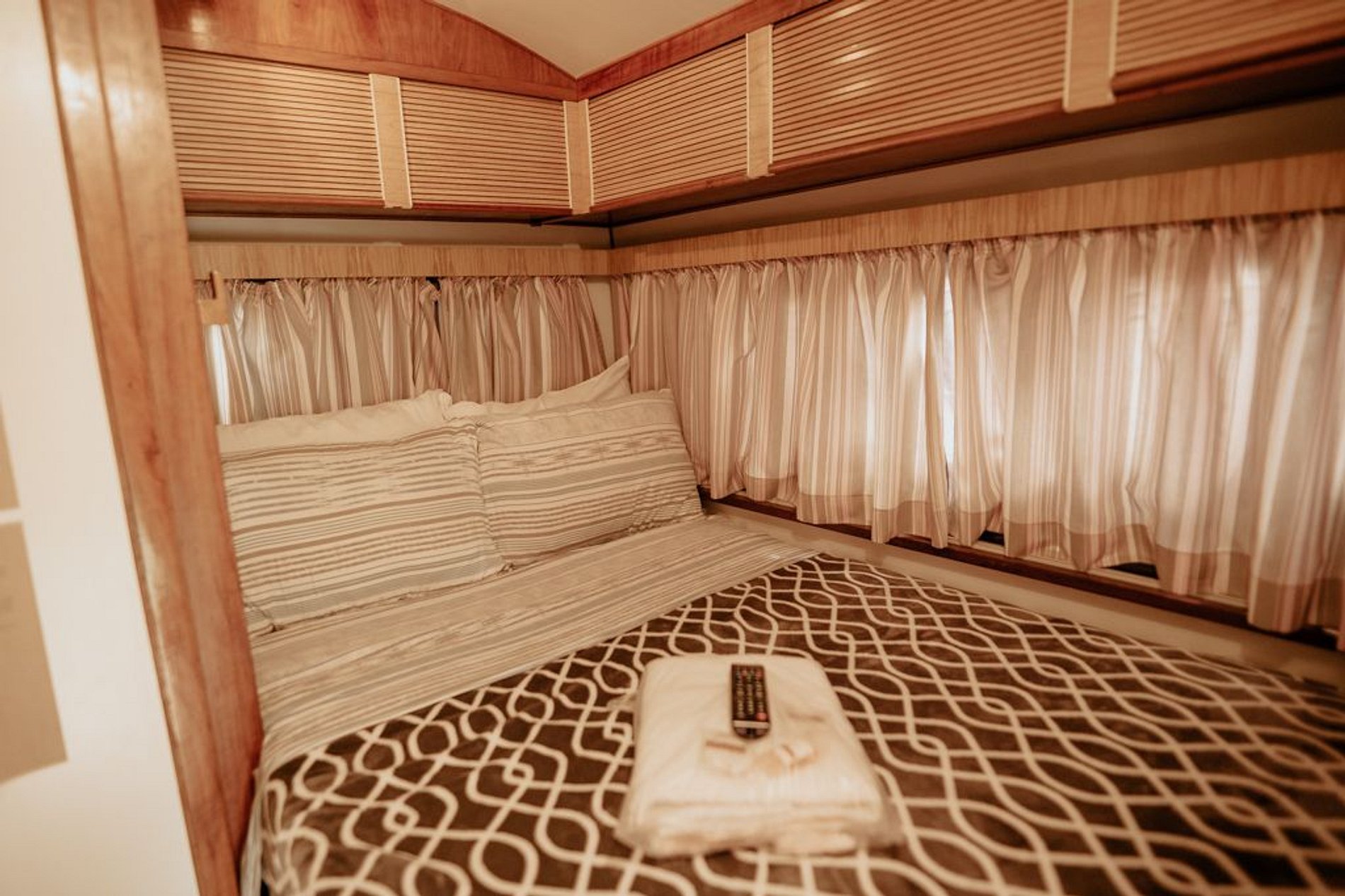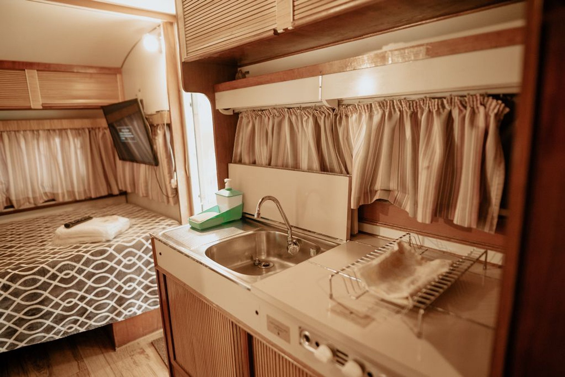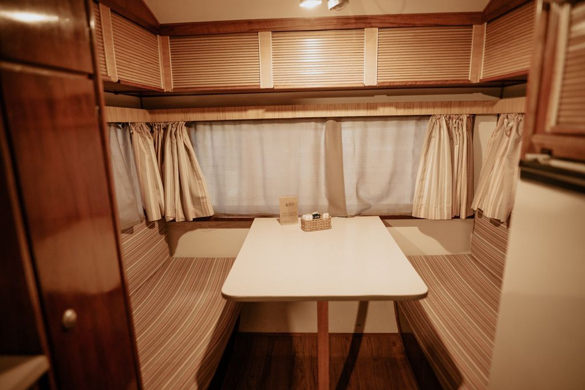 O Trailer Classic 1975 é uma verdadeira casa sobre rodas! Tem quarto, banheiro, cozinha com salinha e até uma varandinha com deck mesa e cadeiras na frente!