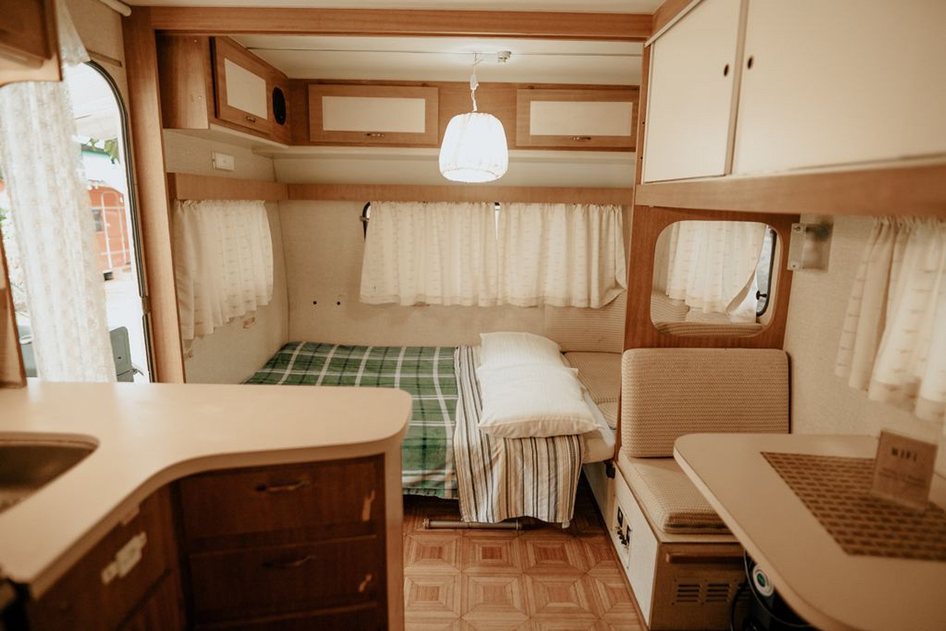 O Trailer Vintage 1989 é uma verdadeira casa sobre rodas! Tem quarto, banheiro, cozinha com salinha e até uma varandinha com deck mesa e cadeiras na frente! 😍