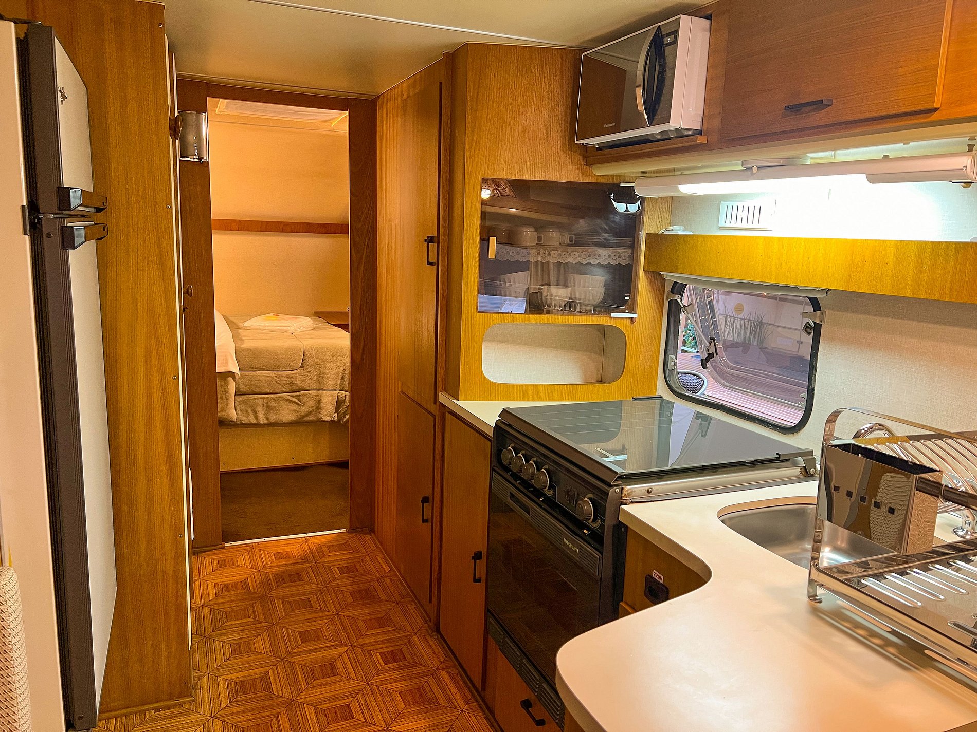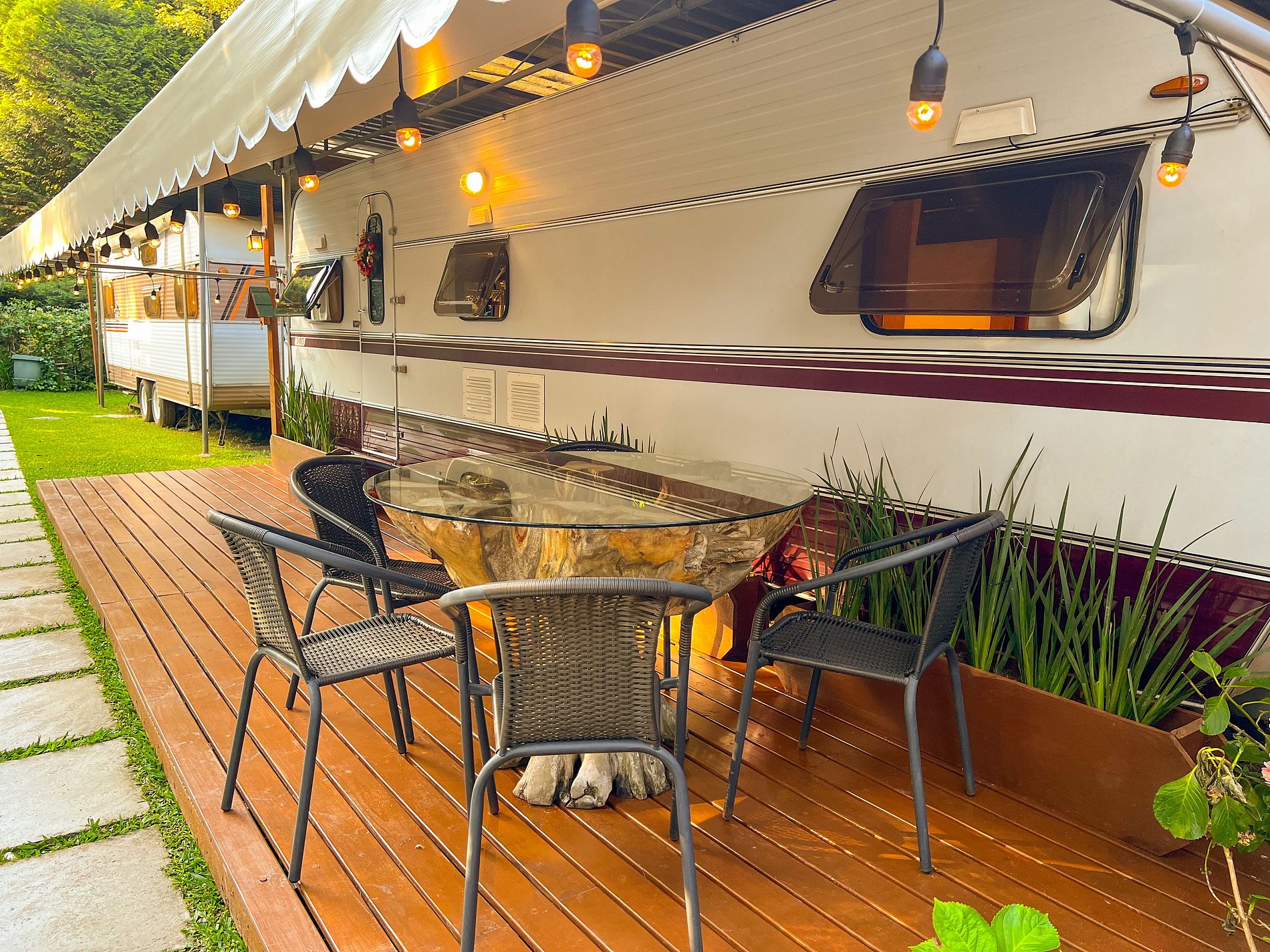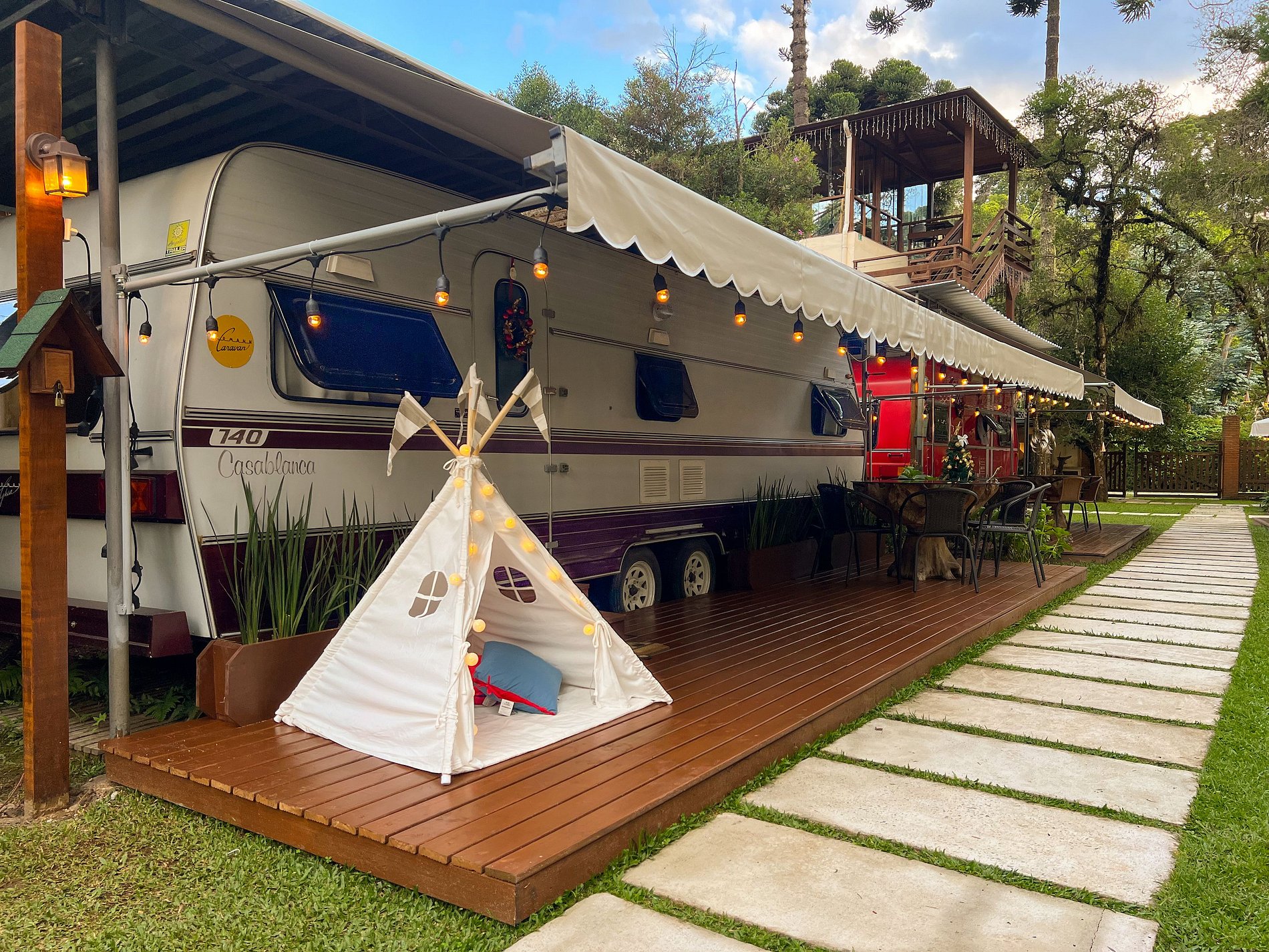 O Trailer Casablanca 1991 é uma verdadeira casa sobre rodas! Tem quarto, banheiro, cozinha com salinha e até uma varandinha com deck mesa e cadeiras na frente! 😍