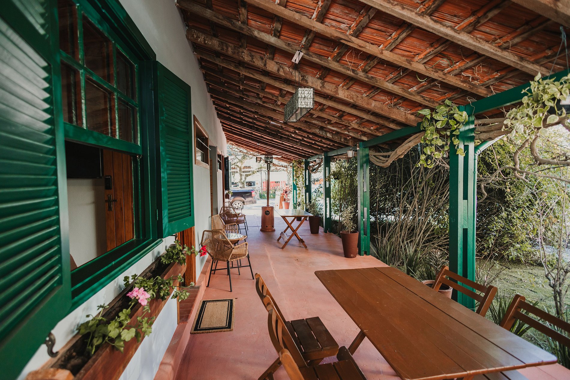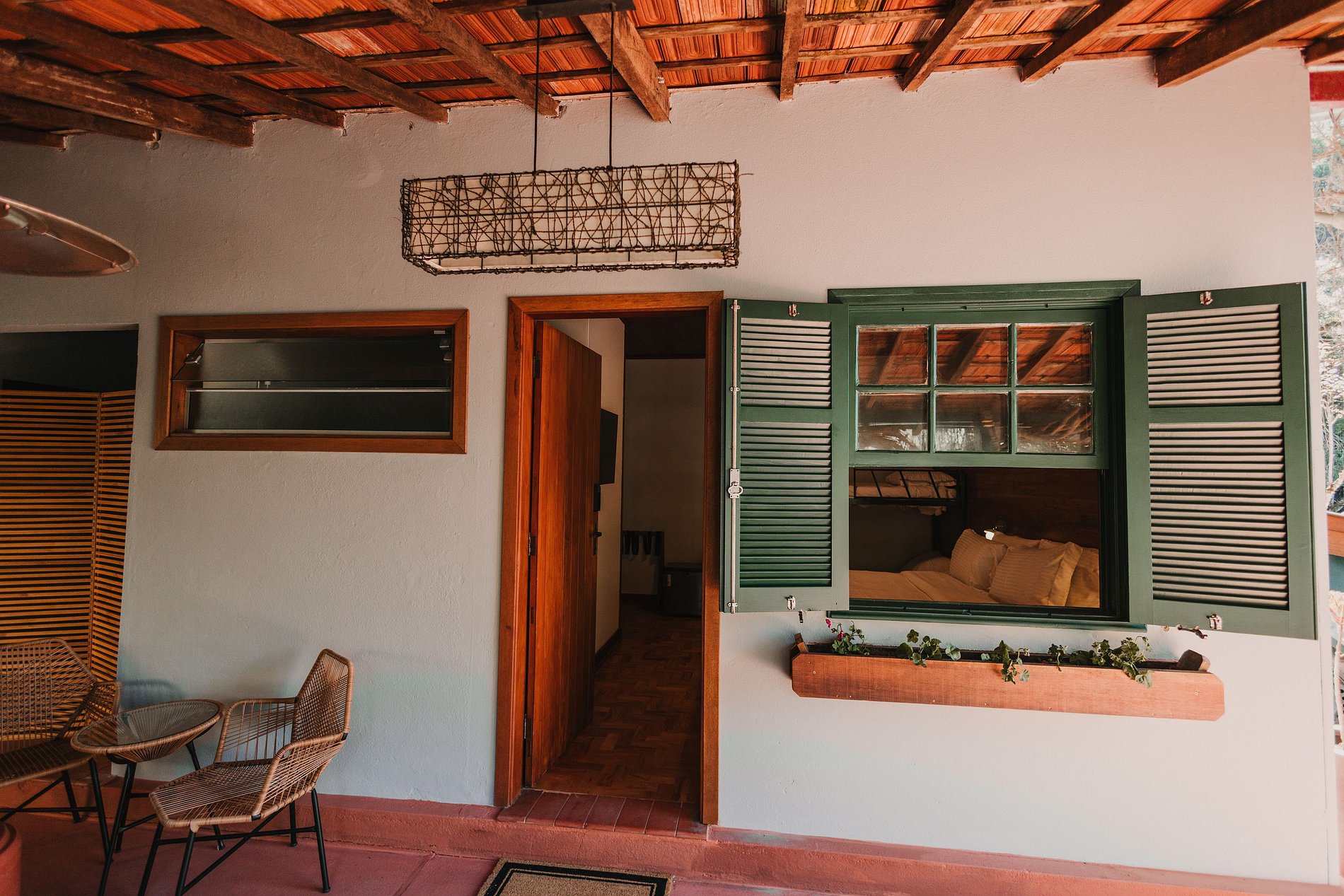 Com piso de taco, cabeceira em bambu e decoração campestre, é um convite ao relaxamento. A varanda, com mesa e poltronas, é perfeita para aproveitar o frescor das manhãs e o verde ao redor com privacidade.