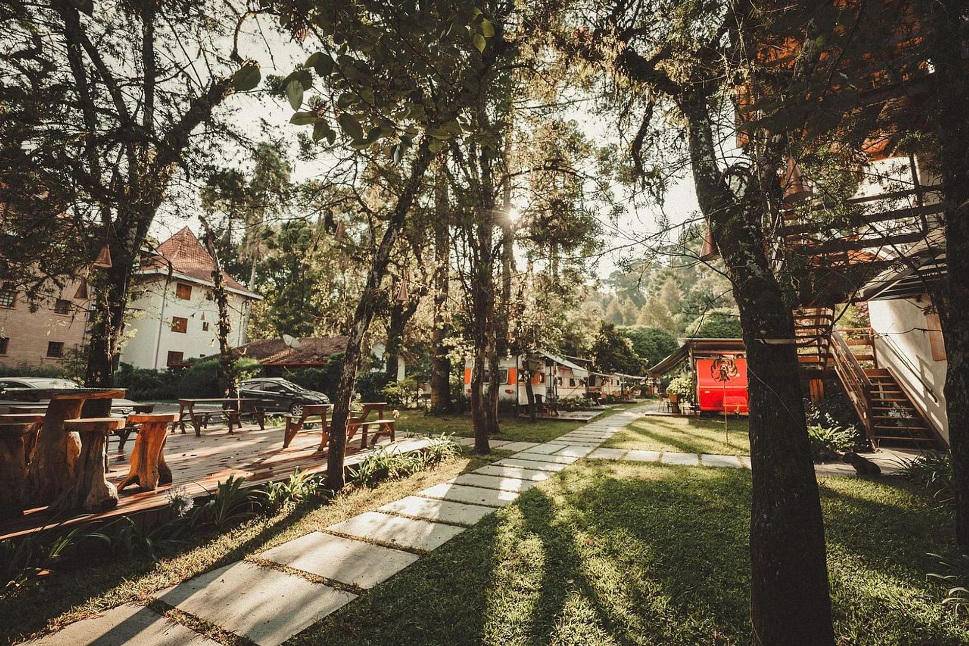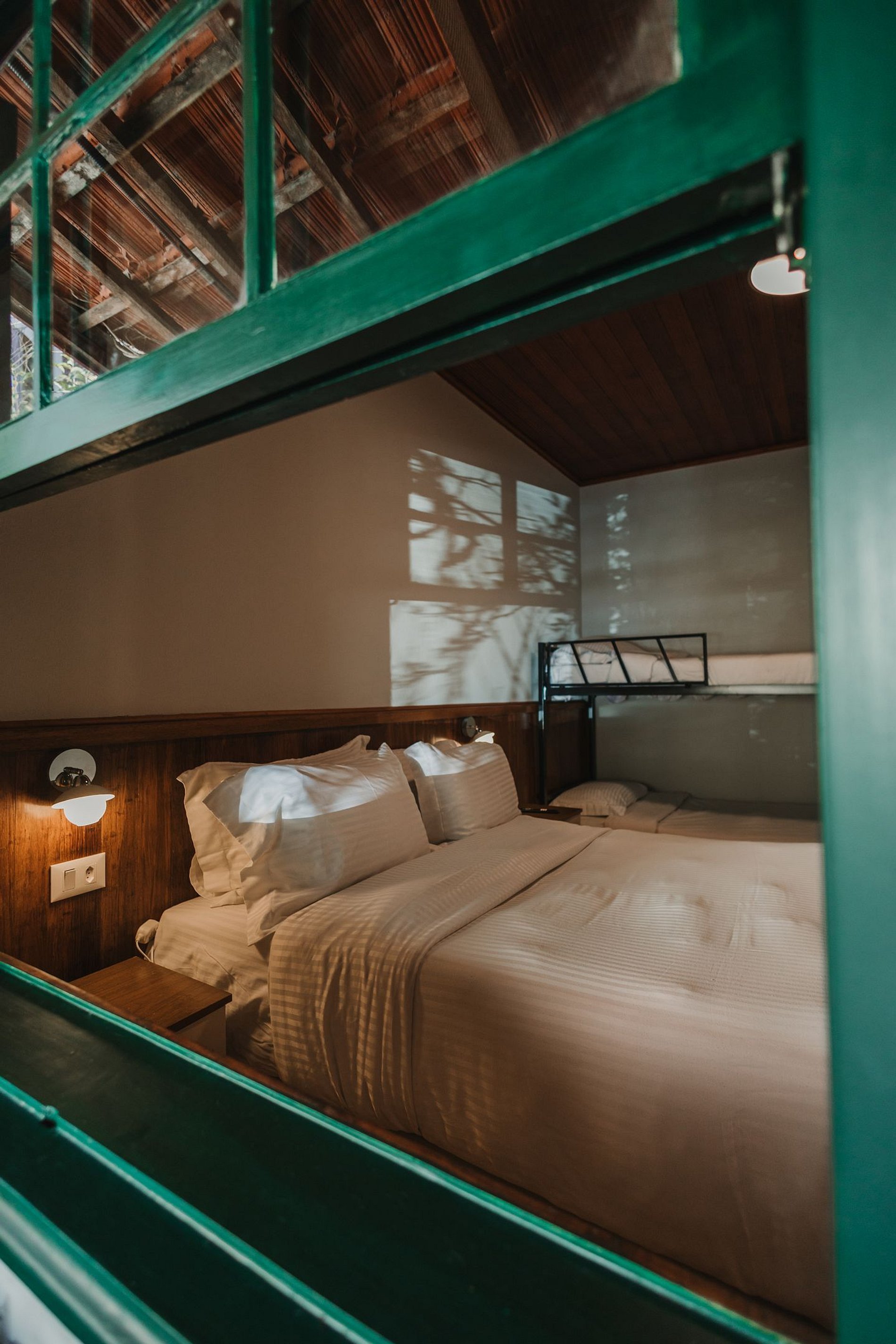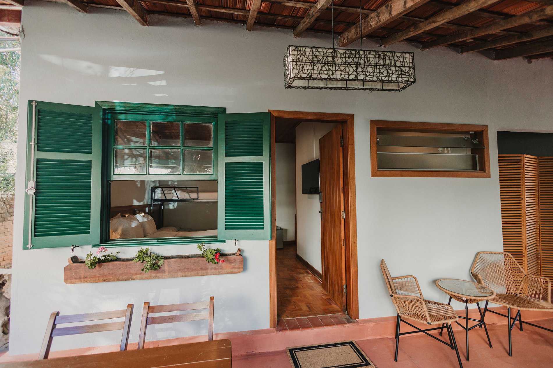 Com piso de taco, cabeceira de bambu e decoração campestre, o ambiente é ideal para casais ou famílias com até 4 pessoas que desejam desacelerar com estilo. A varanda privativa, rodeada por plantas, conta com mesa e poltronas confortáveis — perfeita para um café da manhã tranquilo ou um vinho ao entardecer.