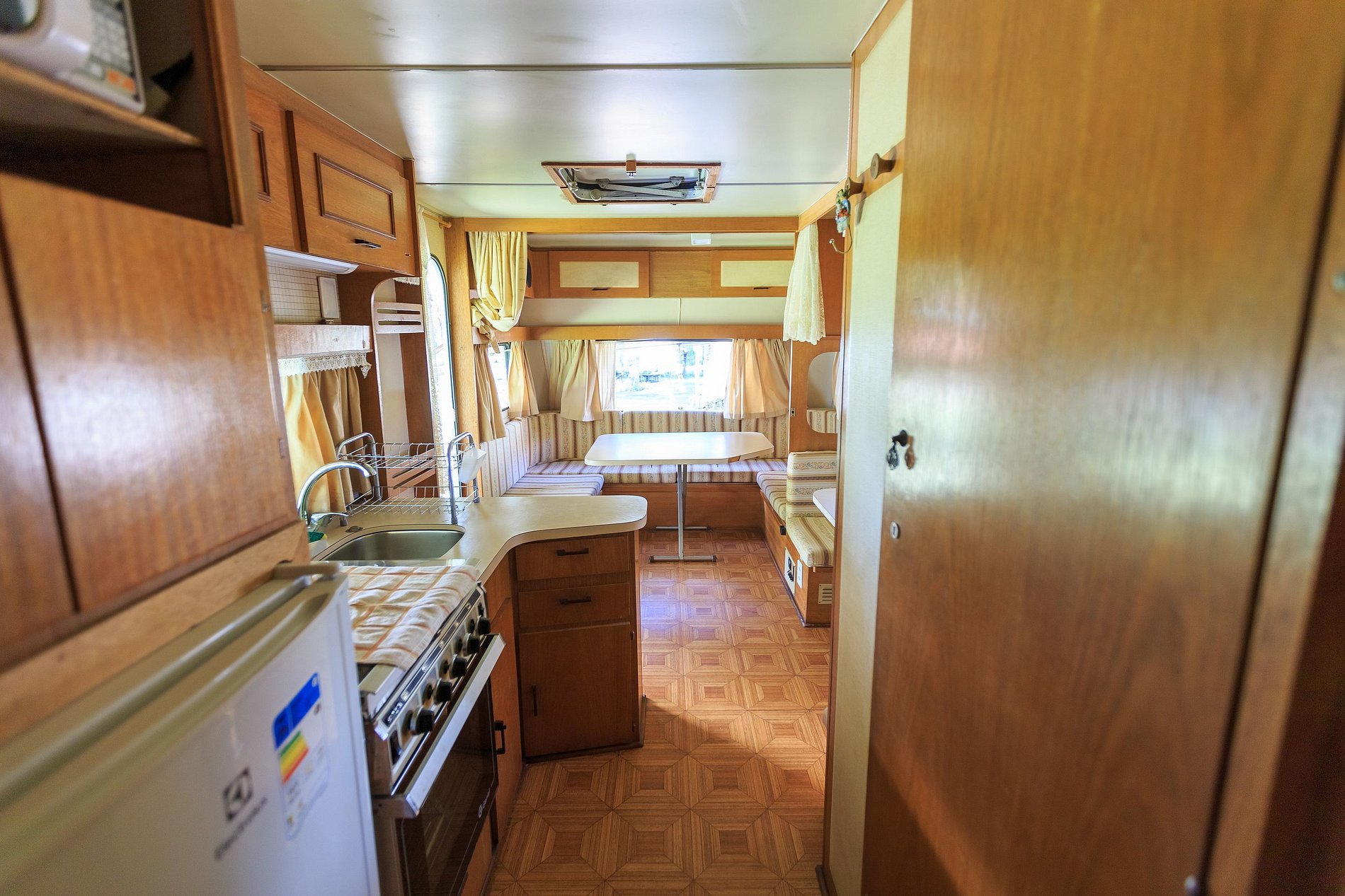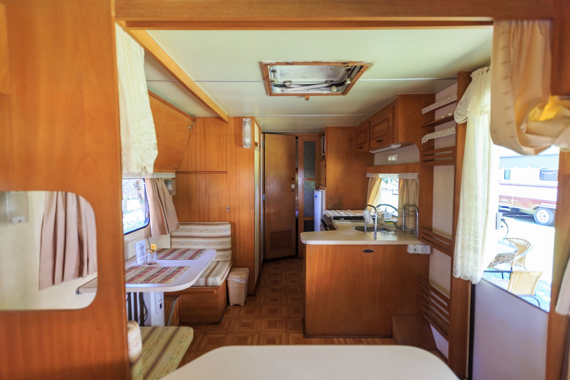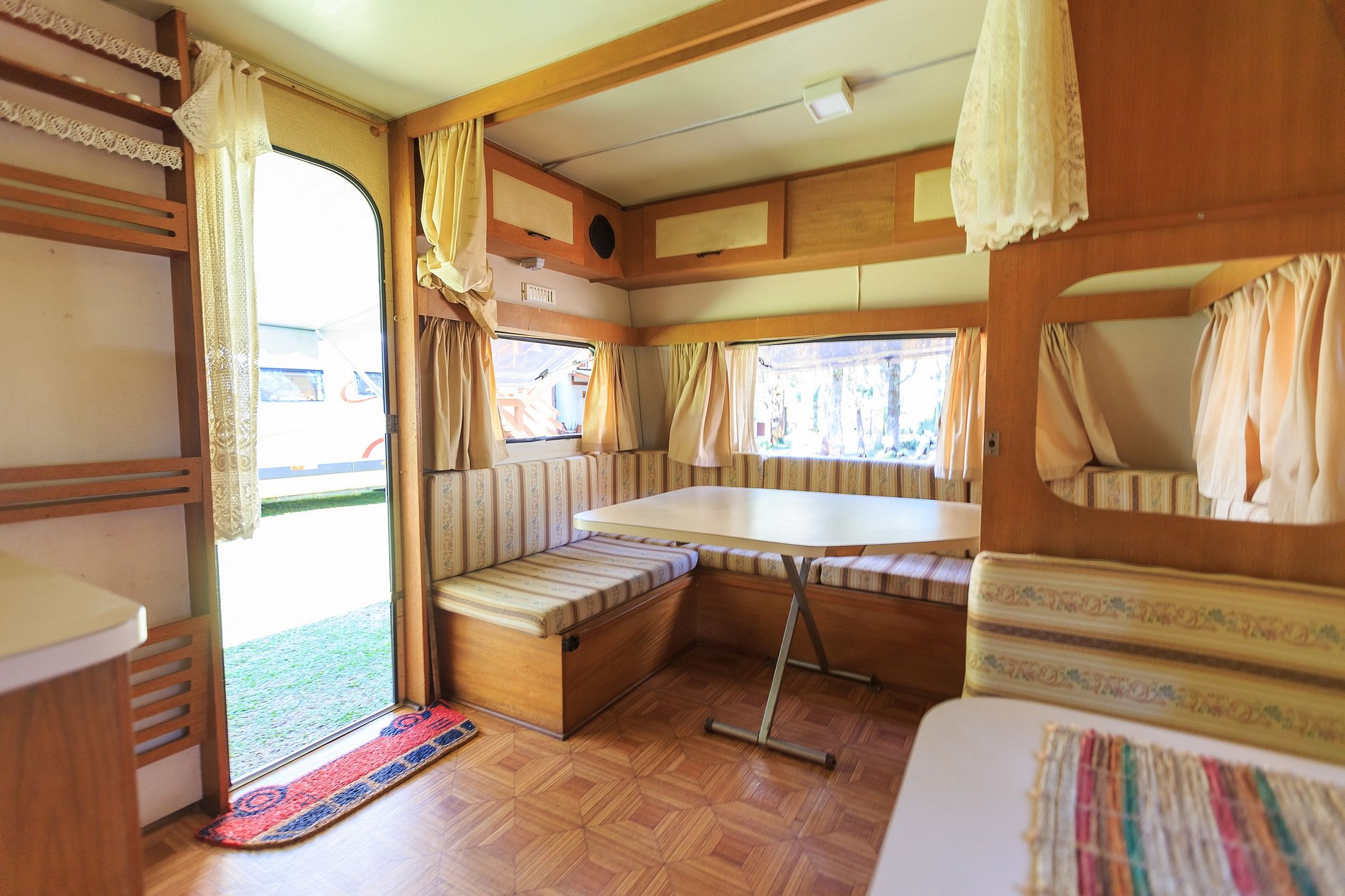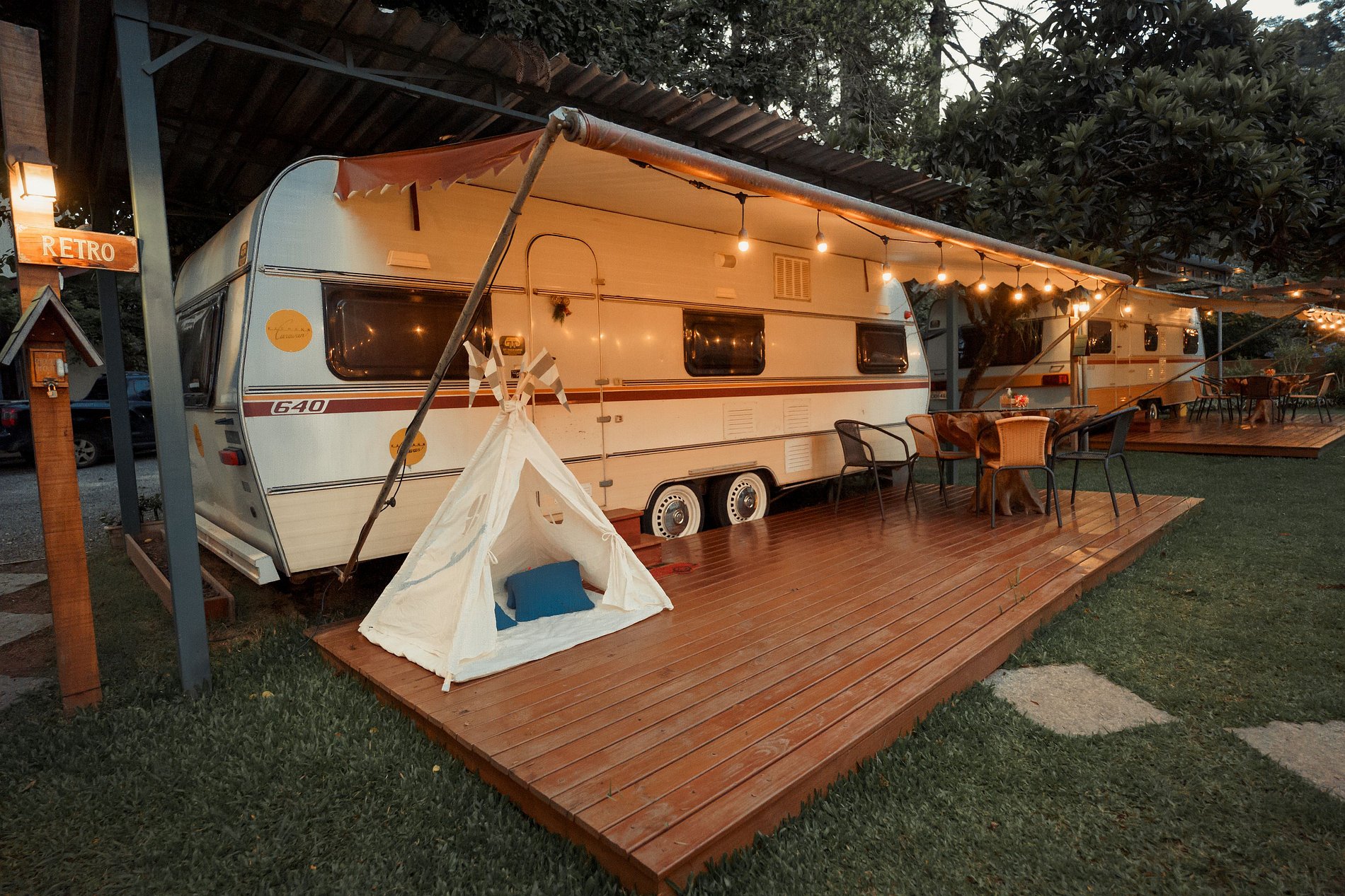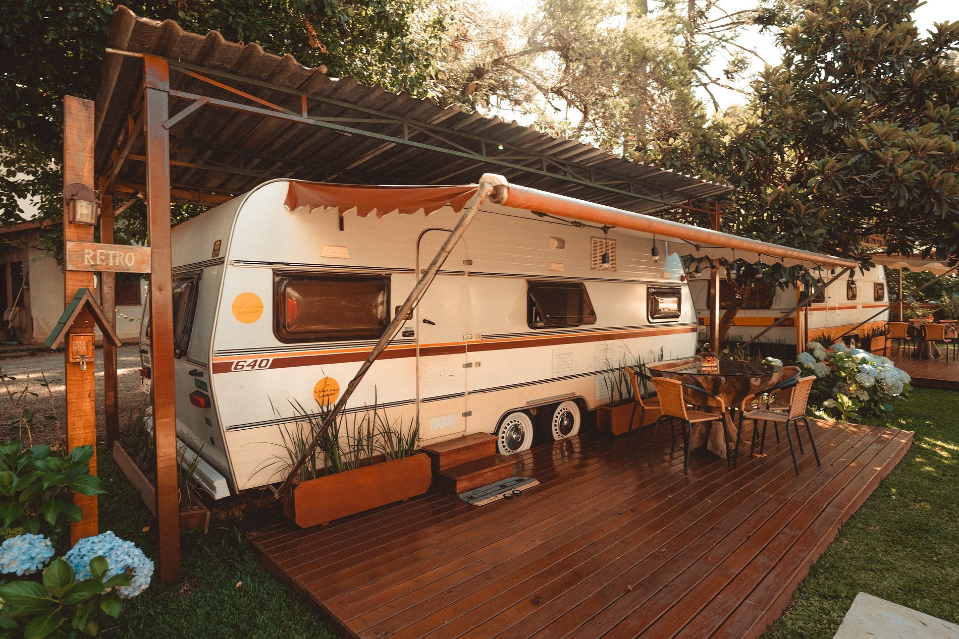 O Trailer Retro 1986 é uma verdadeira casa sobre rodas! Tem quarto, banheiro, cozinha com salinha e até uma varandinha com deck mesa e cadeiras na frente! 😍